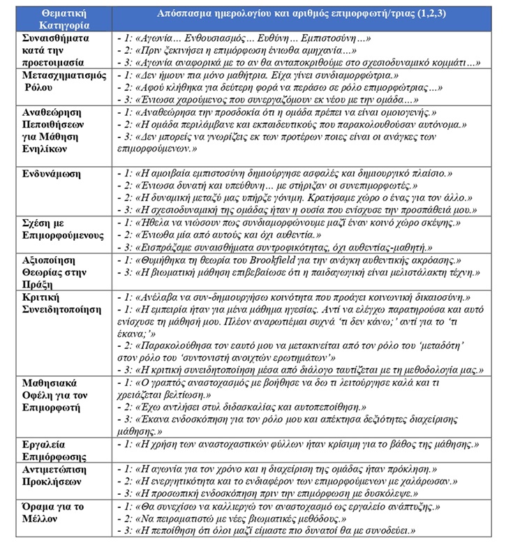 Η ανάλυση των αναστοχαστικών ημερολογίων παρέχει στοιχεία για την πολυδιάστατη εμπειρία του ρόλου των επιμορφωτών/τριών, η οποία περιλαμβάνει τόσο συναισθηματικές όσο και γνωστικές διαστάσεις. Στον ακόλουθο πίνακα (πίνακας 2) παρουσιάζονται χαρακτηριστικά αποσπάσματα από τα ημερολόγιά τους, οργανωμένα κατά θεματικές κατηγορίες, με αναφορά στον αντίστοιχο επιμορφωτή. Κάθε  θεματική κατηγορία αποτυπώνει διαφορετικές όψεις της εμπειρίας τους, ήτοι από τα αρχικά συναισθήματα μέχρι το όραμα για το μέλλον. Οι επιμορφωτές, με βάση την προσωπική τους αναστοχαστική καταγραφή, αναδεικνύουν κοινά σημεία αλλά και διαφοροποιήσεις στην πορεία τους προς τη συμμετοχική ηγεσία και τον νέο τους ρόλο. Ο πίνακας συνοψίζει τα βασικότερα ευρήματα και επιτρέπει μια συγκριτική ματιά στην εξέλιξη της ταυτότητας και των στάσεών τους.