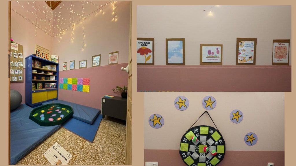 Εικόνα 1: Ο χώρος χαλάρωσης στο Δημοτικό Σχολείο Κουρνά, με αισθητηριακά υλικά, γωνιά βιβλιοθεραπείας και φωτισμό που ενισχύει την αίσθηση ασφάλειας και ηρεμίας.
