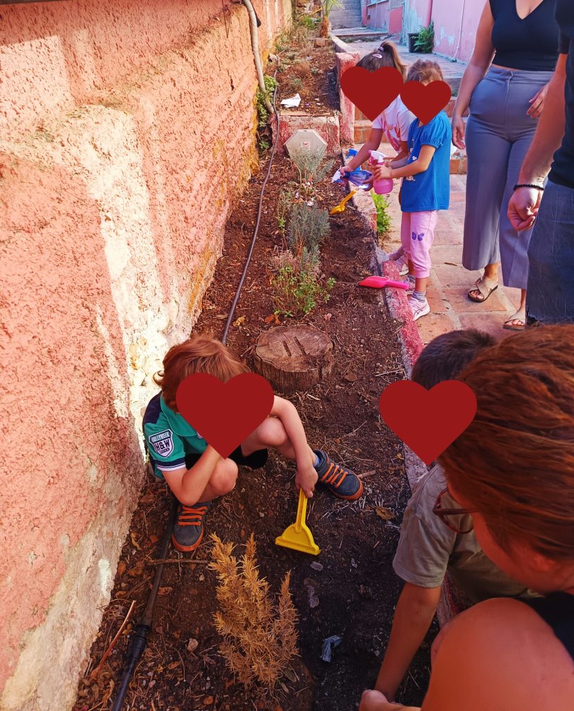 Χρησιμοποιήθηκαν φιλικά υλικά και εργαλείαΤα παιδιά συμμετείχαν ενεργά στη φύτευση λουλουδιών και αρωματικών φυτών, με καθοδήγηση από τους εκπαιδευτικούς. Τα φυτά είχαν επιλεγεί προκαταβολικά, λαμβάνοντας υπόψη τις δυνατότητες φροντίδας από τα παιδιά. Τα παιδιά έσκαψαν με εργαλεία ή και με τα χέρια και τοποθέτησαν τα φυτά με την βοήθεια των εκπαιδευτικών. Κάλυψαν με χώμα τις ρίζες και έριξαν νερό. Η εμπειρία αποτέλεσε σημαντικό εργαλείο βιωματικής μάθησης.