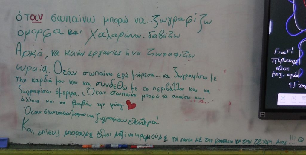 Σημείωση: Όλες οι εικόνες αποτελούν πρωτότυπο υλικό που δημιουργήθηκε από τους μαθητές/τριες στο πλαίσιο του ομίλου εικαστικής παιδείας. Το οπτικό υλικό είναι μη αναγνωρίσιμο και έχει υποστεί επεξεργασία όπου απαιτείται, με σεβασμό στα προσωπικά δεδομένα.